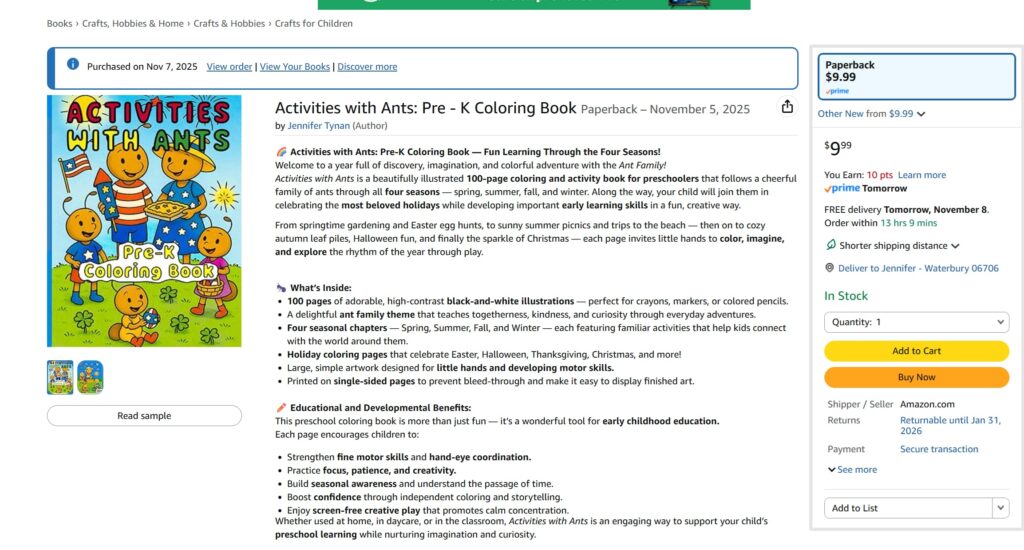 Activities with Ants by Jennifer Tynan. A Pre-K coloring book for sensory stimulation and developmental learning. As Seen on Amazon.